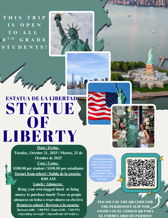 The Dual Language Department is sponsoring a trip for all 8th graders! We will be visiting two of our nation’s most famous landmarks: The Statue of Liberty and the Ellis Island Museum in New York.  The trip is open to ALL 8th grade students.  If you are interested please read the flyer and fill out the Statue of Liberty Field Trip  DL Permission Slip.  Please reach out to Sra. Chimento chimentos@norwalkps.org if you are interested in going.  ALL PAYMENTS ARE DUE BY WEDNESDAY, OCT. 15th. THERE ARE ONLY A FEW SPOTS LEFT!