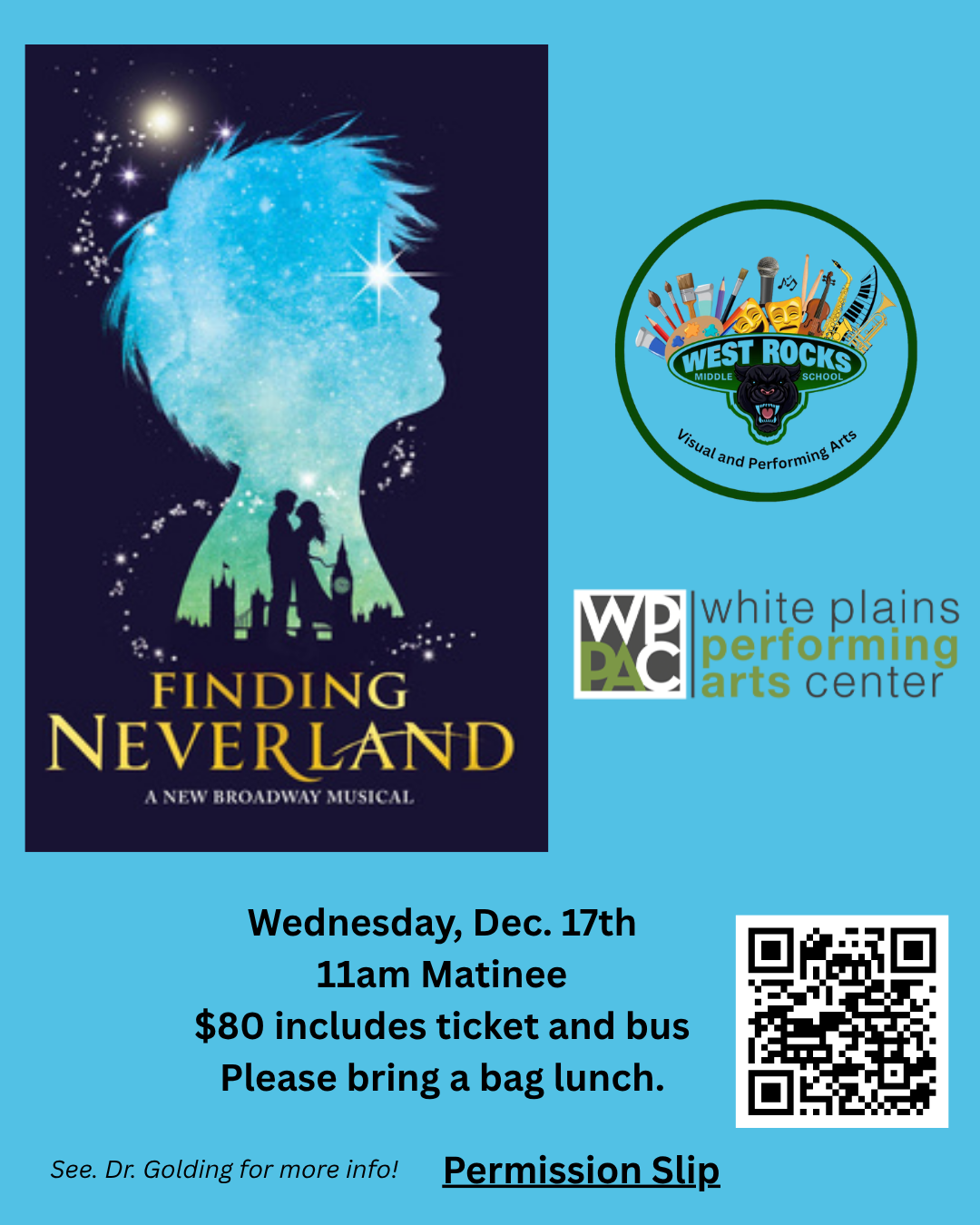 We are excited to announce a field trip opportunity for our 7th and 8th Grade VPA students this December! We have secured tickets for an 11:00 AM matinee performance of the Broadway musical Finding Neverland at the White Plains Performing Arts Center.