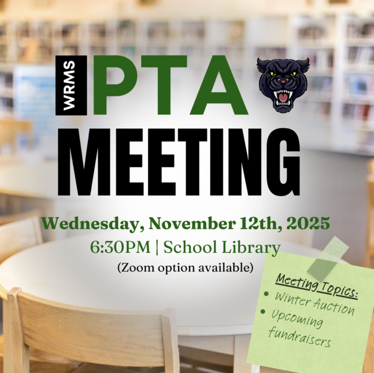 Our next PTA Meeting will be held on Wednesday, November 12th at 6:30PM in the school library (or join us on Zoom!).