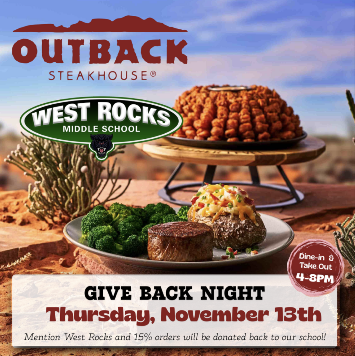 Mention West Rocks when you dine in or order take out and 15% of your order will be donated back to our school!