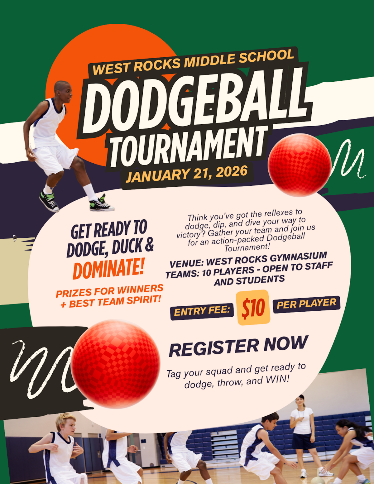Grade 6 is sponsoring a Dodgeball Tournament, and all West Rocks students and staff members are invited to participate.