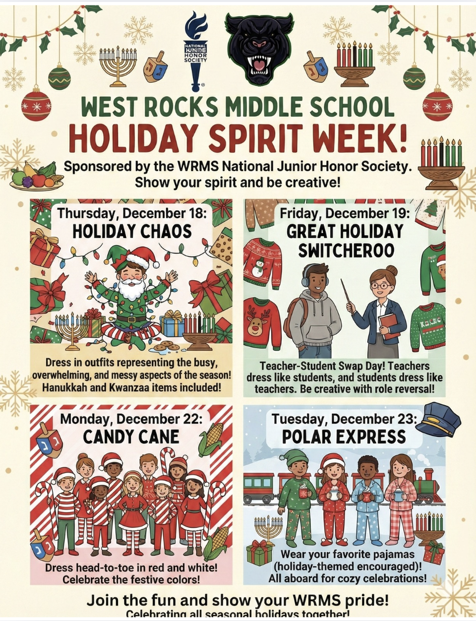 Our National Junior Honor Society is sponsoring our annual Holiday Spirit Week! Be sure to check out the flyer above so everyone can join in on the fun during the last four school days before break: this Thursday, Friday, and next Monday and Tuesday. We’re looking forward to seeing lots of school spirit as we head into the holidays together.