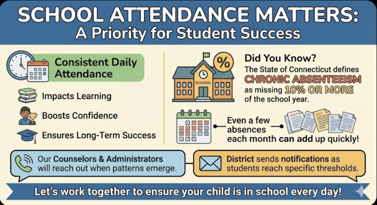 One of our continued priorities this year is making sure students attend school every day, as consistent attendance has a major impact on learning, confidence, and long-term success. The State of Connecticut defines chronic absenteeism as missing 10% or more of the school year, and even a few absences each month can add up quickly. Our counselors and administrators will continue reaching out to families when patterns emerge, and the district has begun sending notifications as students reach specific thresholds. Thank you for helping us support strong attendance habits.