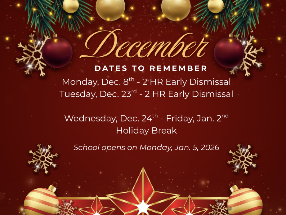 We have an early dismissal tomorrow, Monday, December 8. Students will be dismissed at 12:50 PM, and our staff will participate in professional development during the afternoon.