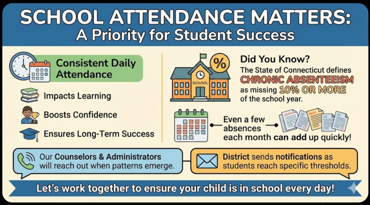 One of our continued priorities this year is making sure students attend school every day, as consistent attendance has a major impact on learning, confidence, and long-term success. The State of Connecticut defines chronic absenteeism as missing 10% or more of the school year, and even a few absences each month can add up quickly. Our counselors and administrators will continue reaching out to families when patterns emerge, and the district has begun sending notifications as students reach specific thresholds. Thank you for helping us support strong attendance habits.