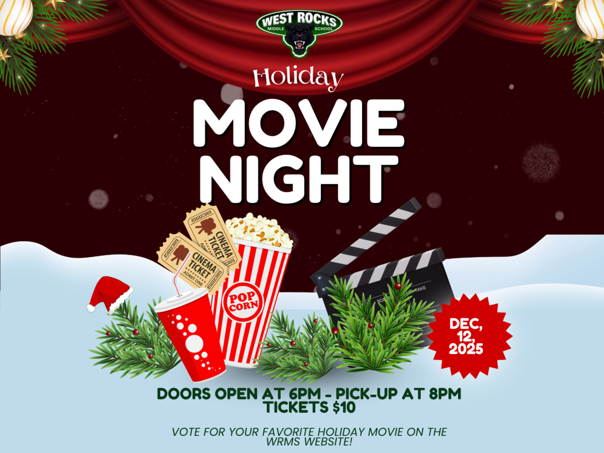 Join us for a Holiday Movie Night on Friday, December 12th! To attend, students must first turn in a signed permission slip to purchase a ticket for $10. We will have delicious and festive snacks available for sale during the event. Please ensure that students are picked up promptly at the end of the evening. Don't forget to cast your vote for the movie at the link below!