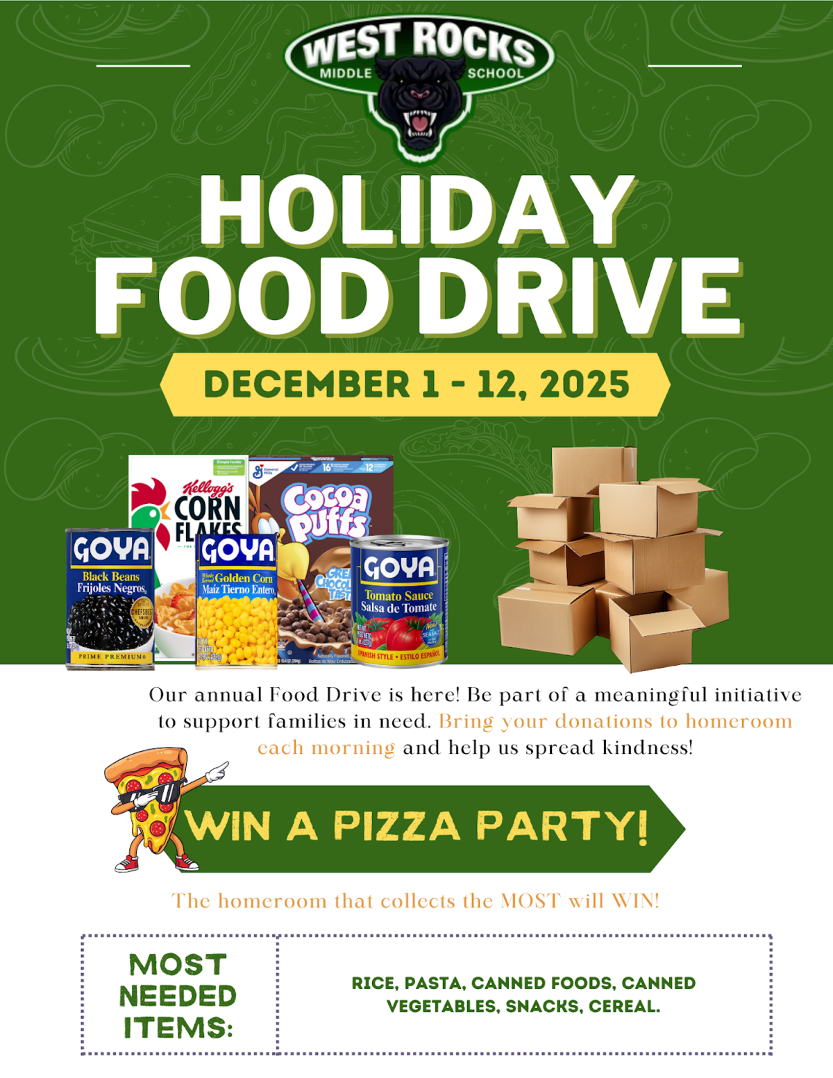 Our annual Food Drive is in full swing, and we are collecting non-perishable items to support families in our community. Every can, box, or bag makes a difference, and we appreciate the generosity already coming through our doors. The homeroom with the most items will earn a pizza party! The last day to donate is this Friday, so please consider sending in an item or two if you are able.
