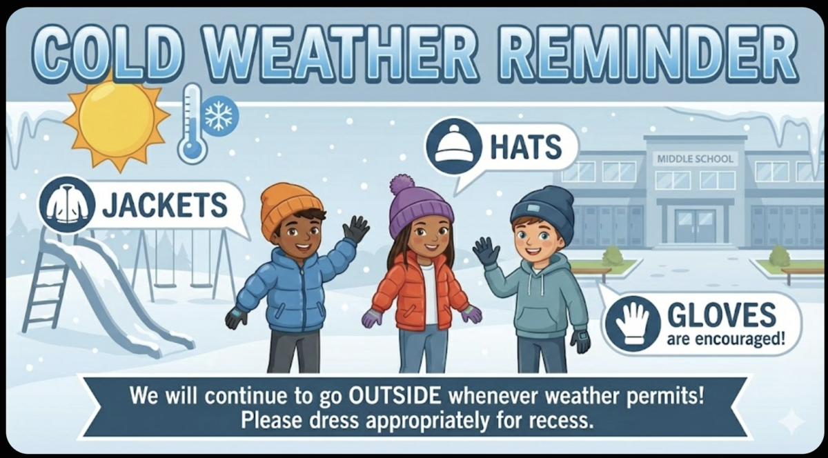 As temperatures continue to drop, please make sure your student is dressed appropriately for outdoor recess, jackets, hats, and gloves are encouraged. We will continue to go outside whenever the weather permits.