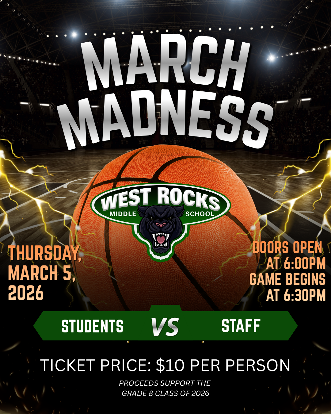 SAVE THE DATE: The Class of 2026 will sponsor our annual March Madness Staff vs. Student Basketball on Thursday, March 5th.