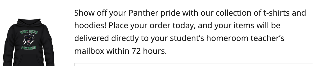 T-Shirts & Hoodies → Available now! Orders will be delivered to your child’s homeroom teacher’s mailbox within 72 hours.