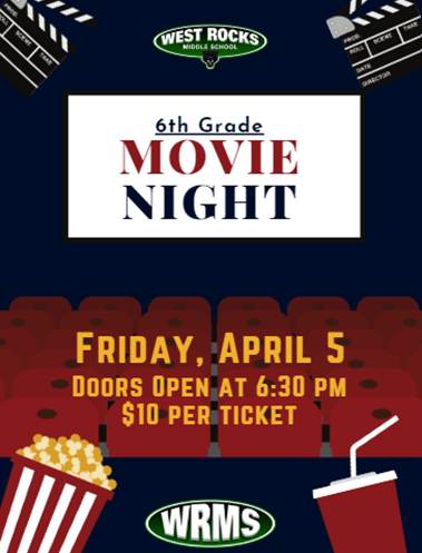 6th Grade will be sponsoring a Movie Night on Friday, April 5th, from 6:30 P.M. to 8:45 P.M. All West Rocks students are invited to attend. The cost to attend is $10. Proceeds will benefit the Grade 6 field trip to the American Museum of Natural History, and refreshments will be available for purchase. Students should complete permission slips and return them with $10 to purchase a ticket. Permission slips and tickets will also be available during all lunch waves starting Monday, April 1st.