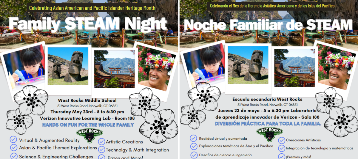 Family STEAM Night Celebrating Asian American and Pacific Islander Heritage Month this Thursday May 23, 5:00-6:30 pm. HANDS ON FUN FOR THE WHOLE FAMILY! Virtual & Augmented Reality, Asian & Pacific Themed Explorations, Science & Engineering Challenges, Artistic Creations, Technology & Math Integration, Prizes and More!