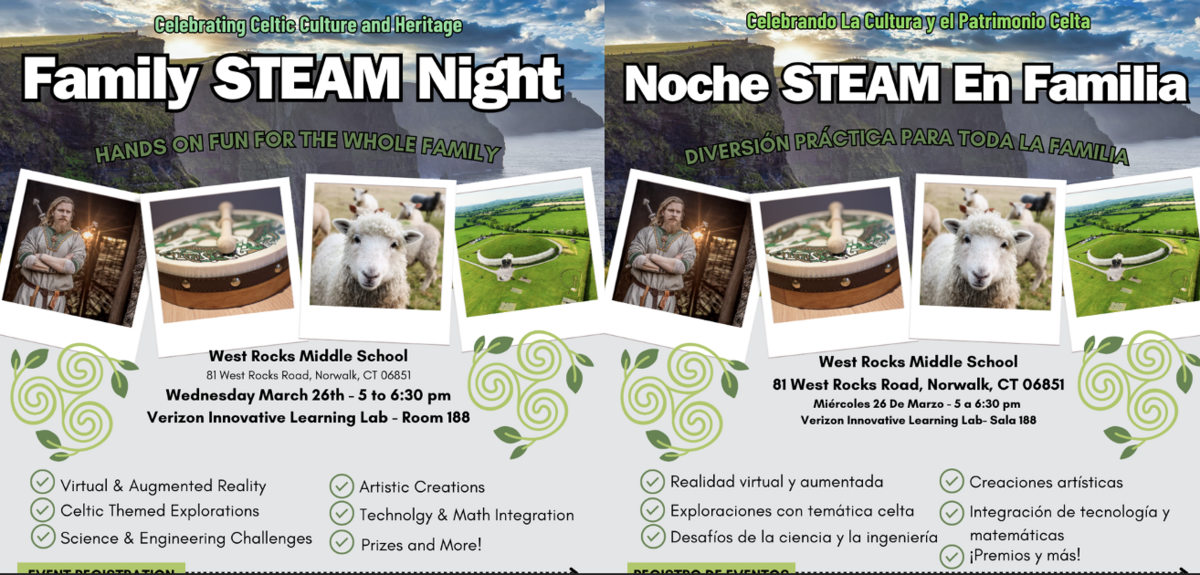 Family STEAM Night Join us in celebrating Celtic Culture and Heritage Hands on Fun for the Whole Family! Wednesday, March 26th - 5 to 6:30 pm, Verizon Innovative Learning Lab - Room 188